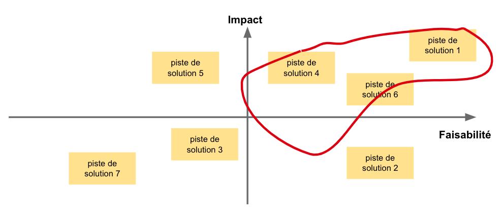 <table data-header-hidden><thead><tr><th width="207"></th><th></th></tr></thead><tbody><tr><td><mark style="background-color:orange;">Quoi</mark></td><td>S’aligner sur les pistes de solutions à pérenniser</td></tr><tr><td><mark style="background-color:orange;">Qui</mark></td><td><strong>Intrapreneur + Coach + UX Designer</strong> + Développeur(s) + autres (experts...)</td></tr><tr><td><mark style="background-color:orange;">Quand/comment</mark></td><td>Après l'atelier d'idéation</td></tr><tr><td><mark style="background-color:orange;">Pré-requis</mark></td><td>Avoir des pistes de solution à prioriser</td></tr><tr><td><mark style="background-color:orange;">Méthodes associées</mark></td><td><a href="atelier-dideation-pistes-de-solution">Atelier d'idéation</a></td></tr></tbody></table>